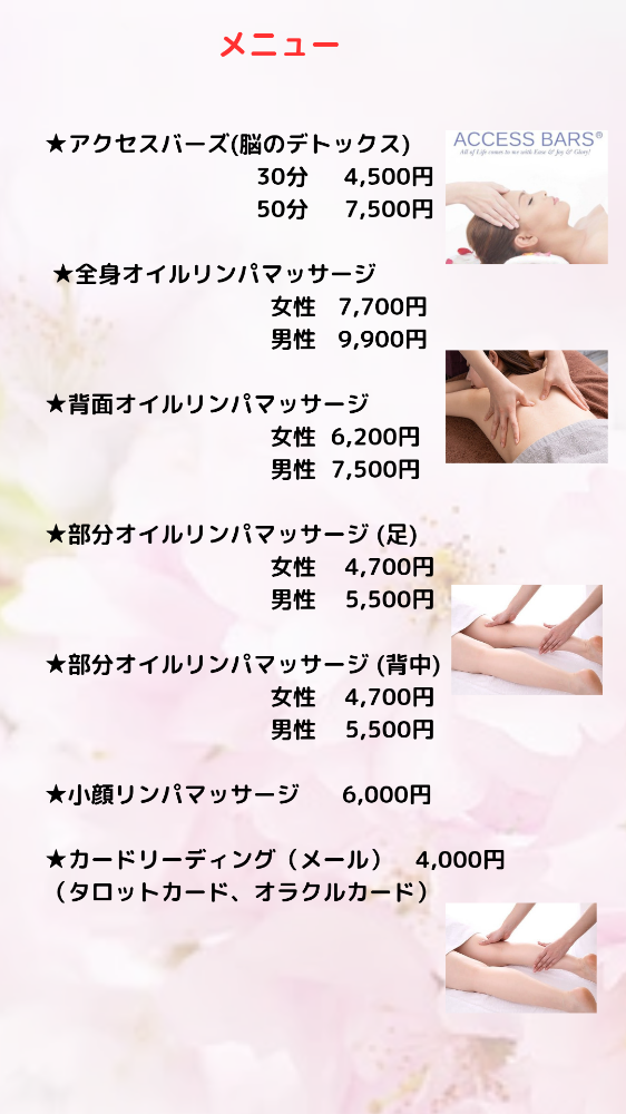 セラピスト1人の為、施術中は電話に出られませんので、ご了承下さい。
